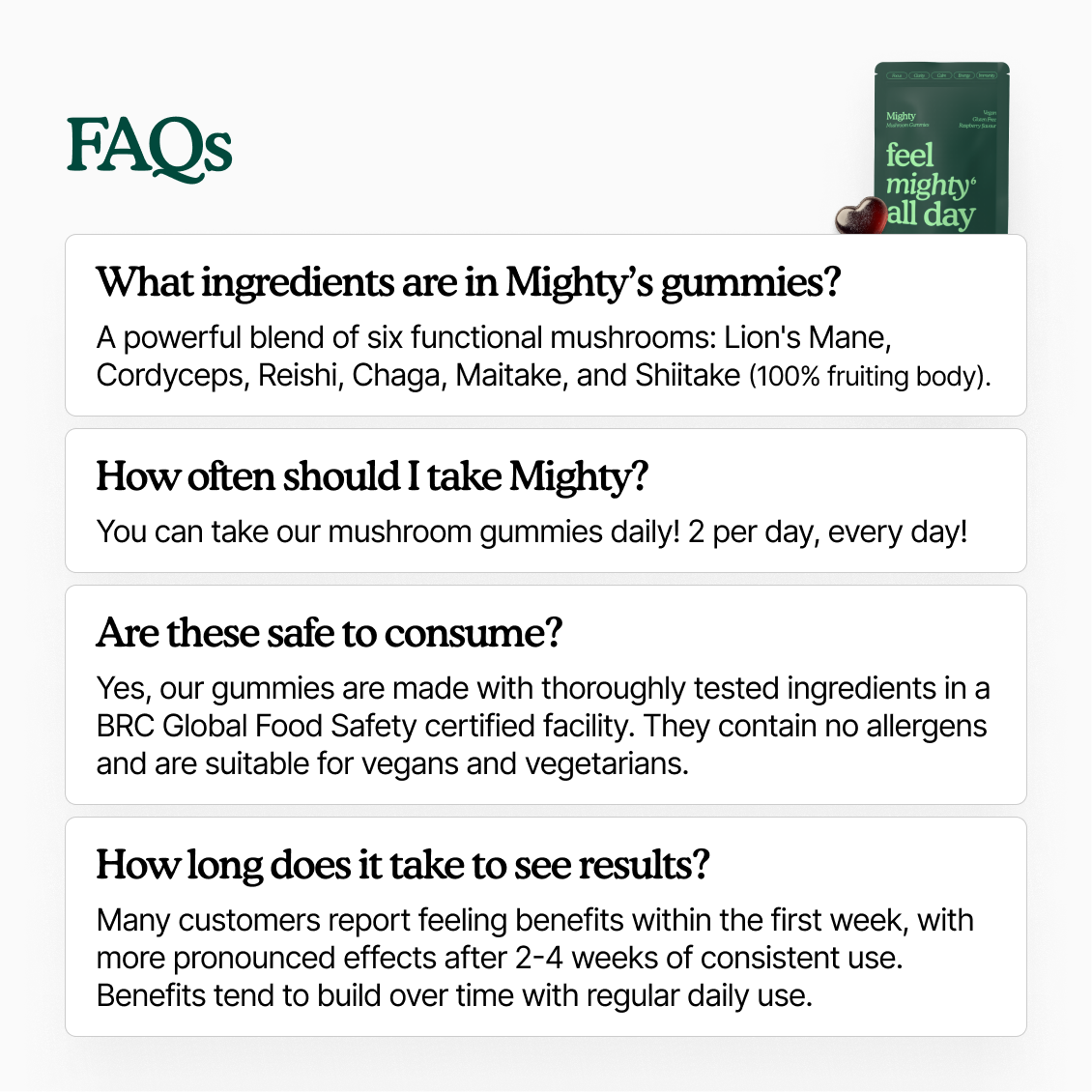 Mushrooms used in our gummies have a long history of safe consumption globally. Most people tolerate them well, but if you experience any adverse reactions or allergies, please seek advice from a healthcare professional immediately.