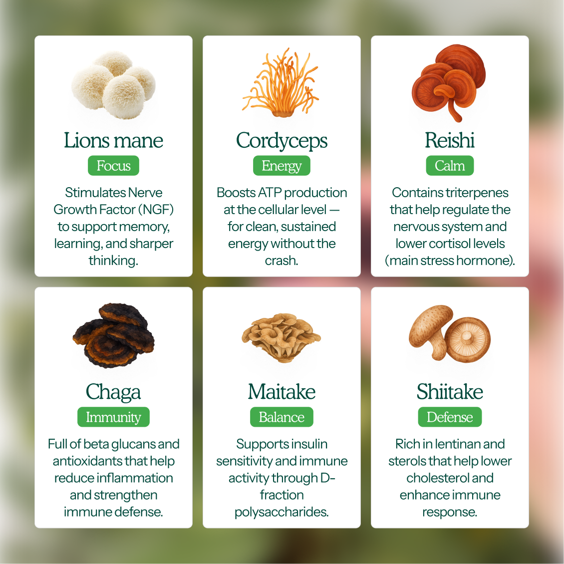We only use the fruiting body — the most nutrient-rich part of the mushroom. It’s where the highest levels of active compounds are found. Unlike mycelium (which often grows on grain and includes fillers), fruiting bodies give you a cleaner, more potent extract.